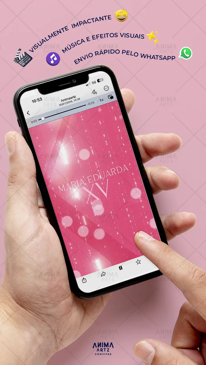 • Personalização com [nome(s) do(s) homenageado(s)], [data], [local] e [detalhes do evento] • Efeitos visuais e sonoros profissionais • Envio digital (link ou WhatsApp)