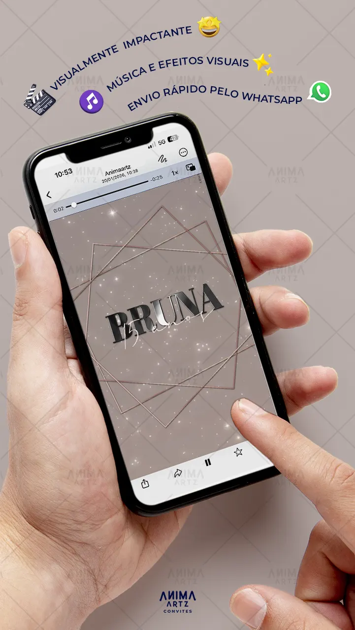• Personalização com [nome(s) do(s) homenageado(s)], [data], [local] e [detalhes do evento] • Efeitos visuais e sonoros profissionais • Envio digital (link ou WhatsApp)