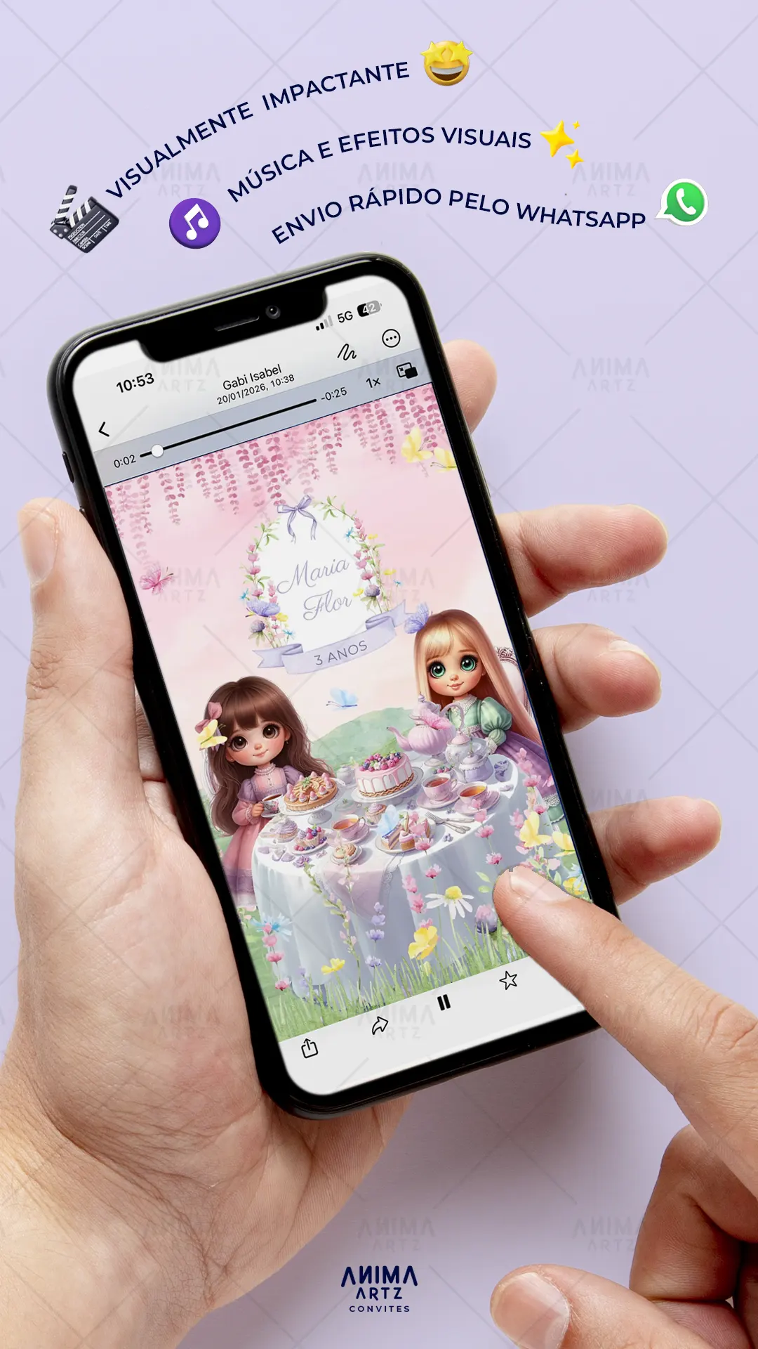 • Personalização com [nome(s) do(s) homenageado(s)], [data], [local] e [detalhes do evento] • Efeitos visuais e sonoros profissionais • Envio digital (link ou WhatsApp)